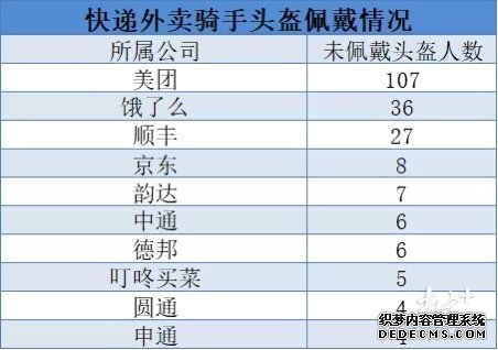 交警数据显示,快递外卖骑手中发现未佩戴头盔人数最多的是美团,107人,与排名第二的饿了么相差71人。此外,顺丰、京东、韵达、叮咚买菜等知名品牌的快递骑手均被查出未戴头盔。