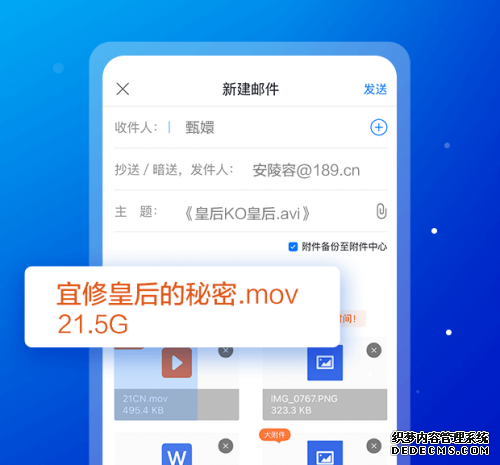5G时代,邮件当然发送更方便,使用新版189邮箱,即使不知道对方邮箱号,写好的邮件也能直接分享到对方微信或QQ,大附件邮件也能直接分享邮件。发送的便捷程度媲美微信QQ消息发送,又不乏商务正式,满足当代职场人的轻办公需求。