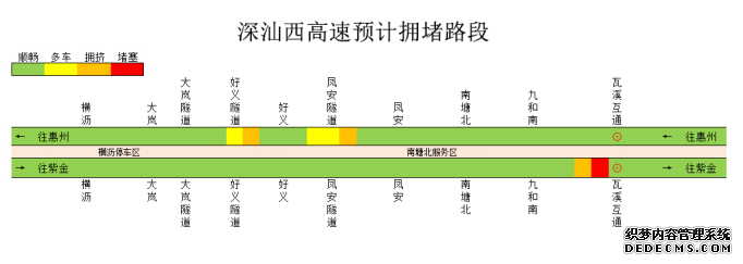 在深汕西高速白云收费站、白云仔收费站,紫惠高速九和南收费站至瓦溪立交路段,可能会出现间歇性车流量较大的情况。深汕西高速白云仔停车区至长沙湾大桥路段因隧道较多,该路段易发生车流缓慢情况。出行途中如遇车流缓慢或分流,车主应听从交警、路政和工作人员的指挥引导。