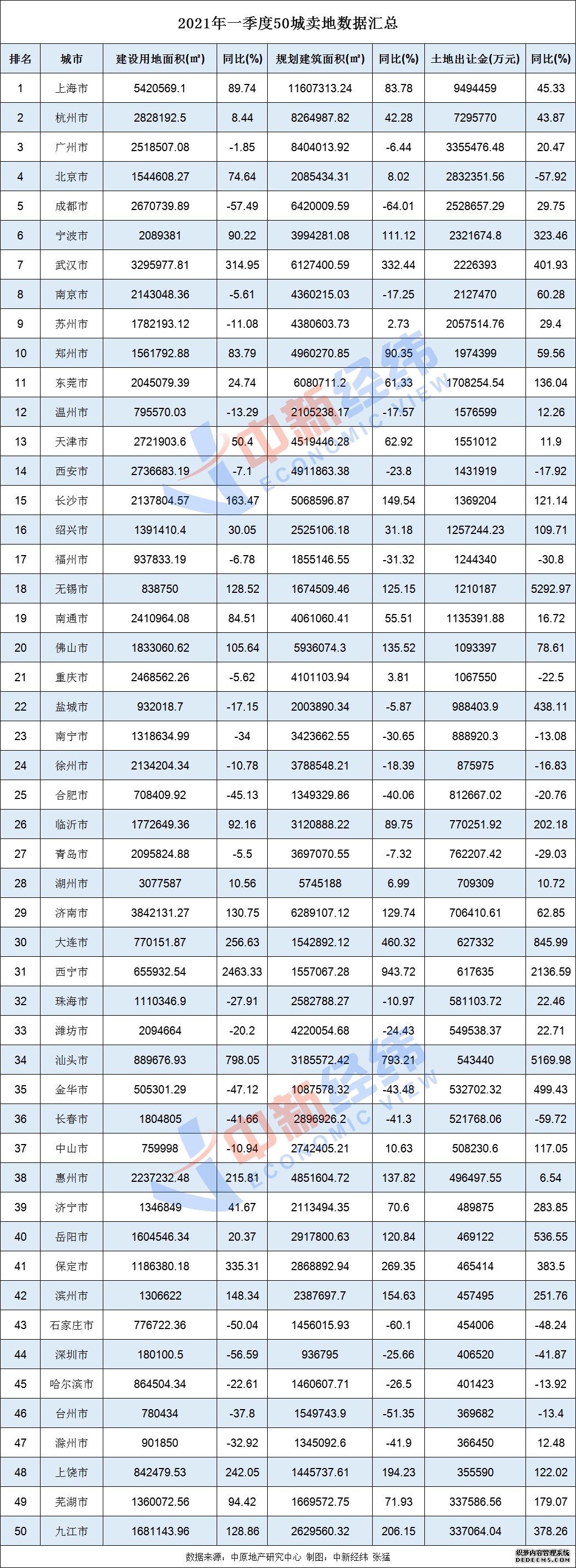 此外,数据显示,一季度,共有上海、杭州、广州、北京、成都、宁波、武汉、南京、苏州、郑州、东莞、温州、天津、西安、长沙、绍兴、福州、无锡、南通、佛山、重庆等21城卖地收入超百亿。