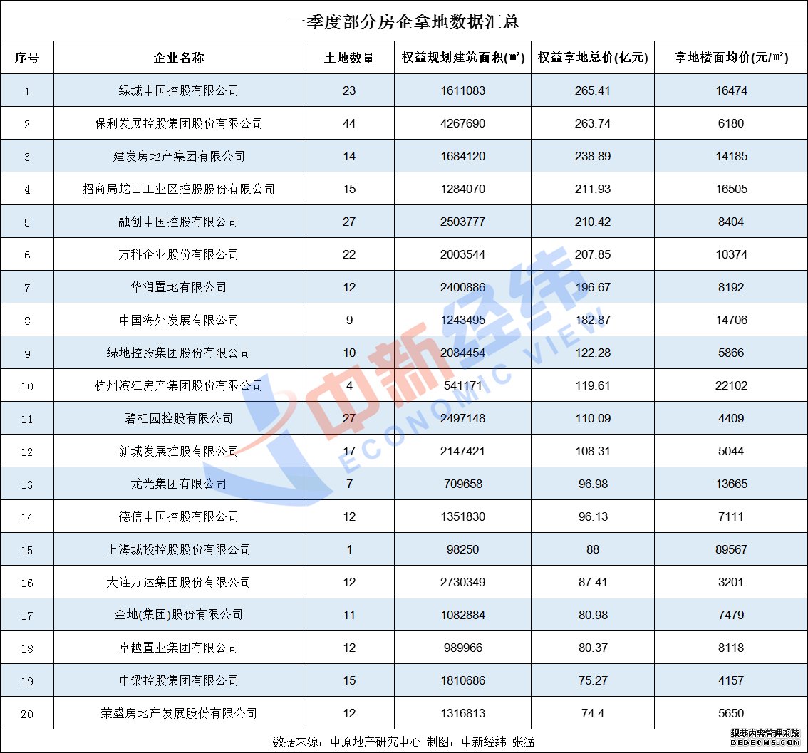 房企拿地方面,中原地产研究中心统计数据显示,一季度,有12家房企拿地超百亿。