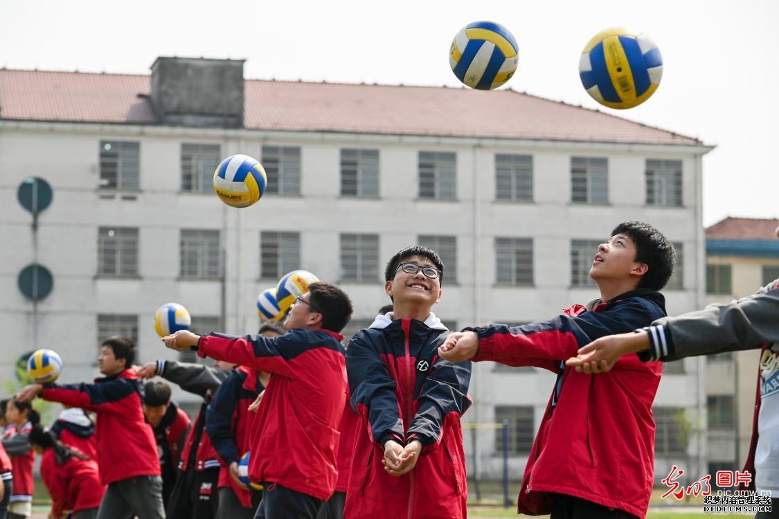 2021年3月31日,浙江省金华市金义新区塘雅中心学校操场上,初三学生利用课间时间进行垫排球运动。为确保学生每天至少有一小时的运动量,金华市金义新区塘雅中心学校每天组织师生参与长跑、跳绳、垫排球、拳击操、羽毛球等课间运动,增强学生体质,促进身心健康。(胡肖飞 摄/光明图片)