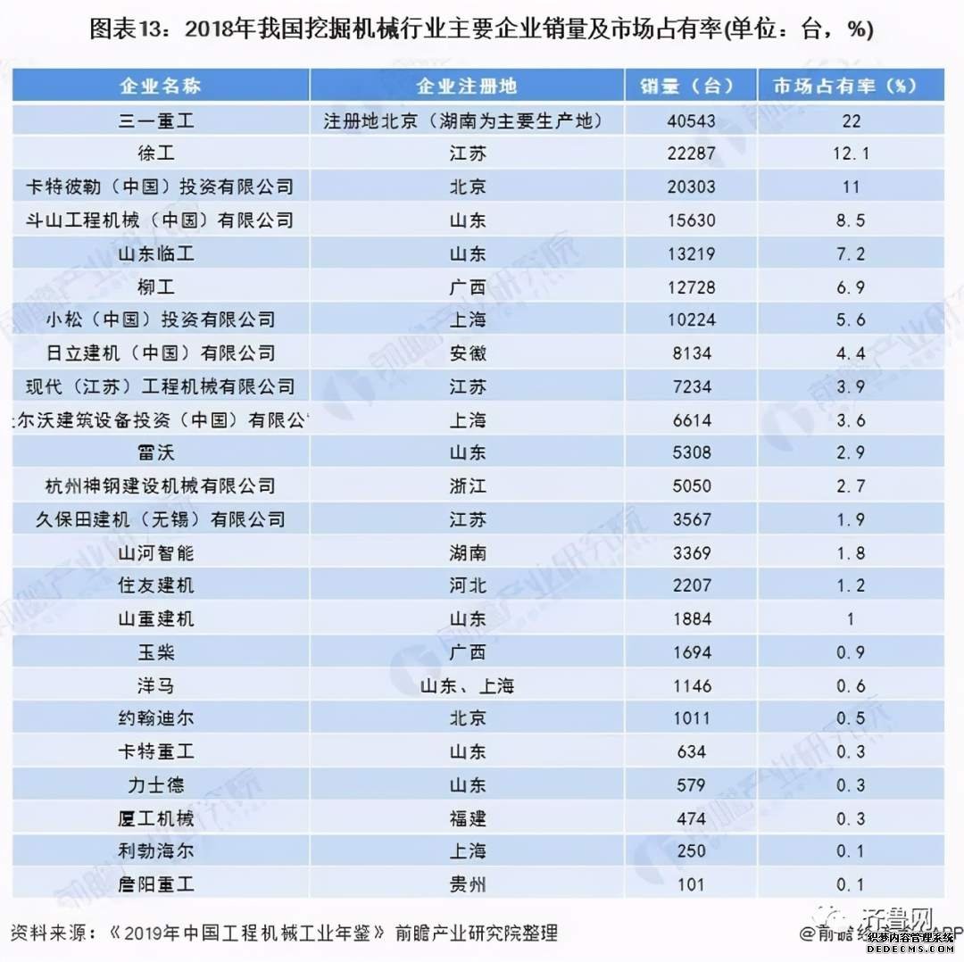 据《2019年中国工程机械工业年鉴》纳入统计的挖掘机主机制造企业销量来看,2018年,国内挖掘机械市场销量前五位企业为三一重工、徐工、卡特彼勒、斗山和山东临工,市场占有率均超过7%。