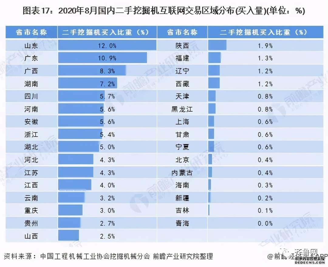 根据中国工程机械工业协会挖掘机械分会数据,2020年8月,买入二手挖掘机最多的还是山东!买入量占比达到12.0%!