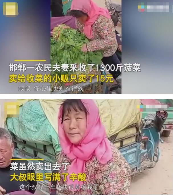 3月28日,河北邯郸,邯郸一农民夫妻采收了1300斤菠菜卖给收菜的小贩只卖了15元。菜虽然卖出去了,大叔眼里写满了辛酸。此事件很快引起争议 对此摊贩回应“能理解他们辛苦,但他们菜质量确实一般”。